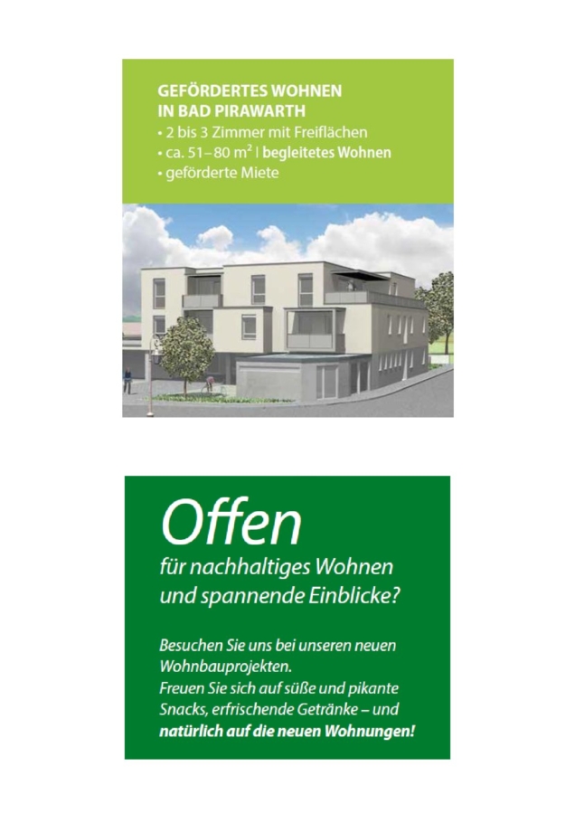 Vorige Nächste zum Inserat der gemeinnützigen Bauvereinigung NBG zum Wohnprojekt Wohnen in Bad Pirawarth 2222 Bad Pirawarth, Obere Hauptstraße 40 Verfügbar NBG Miete Wohneinheit ✔ 2 Zimmer 55,63 m² Fläche 532,36 € Miete 5.006,70 € Eigenkapital